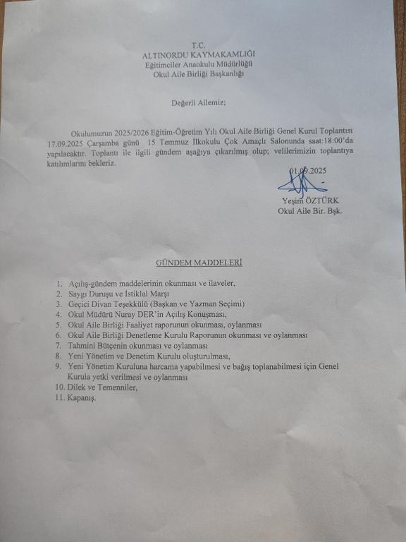 2025-2026 Okul Aile Birliği Toplantısı 17.09.2025 Çarşamba günü saat 18.00 da 15 Temmuz İlkokulu Zemin Katındaki Çok Amaçlı Salonda yapılacaktır.